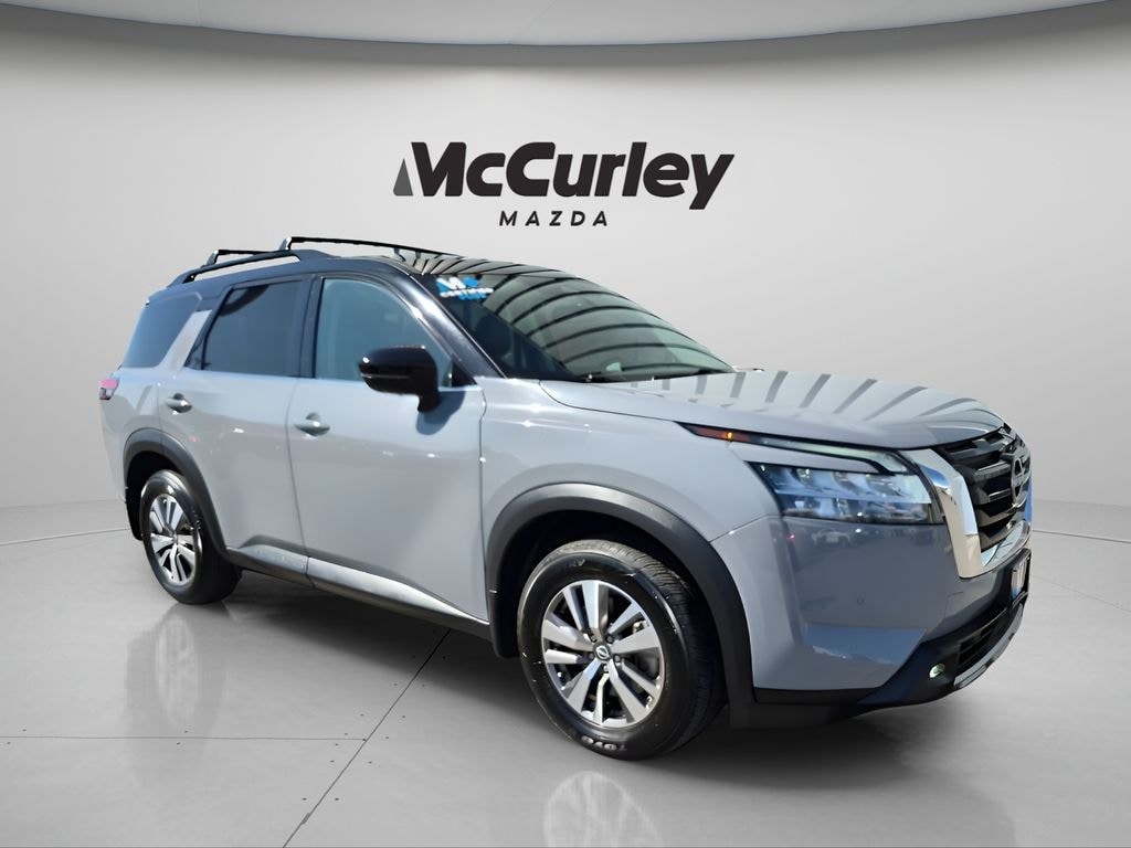 2022 Nissan Pathfinder SL 4WD 9-Speed Automatic V6 Solid Gray/Super Black McCurley Certified + Certified, 4WD, 18" Machined Alloy Wheels, 3rd row seats: bench, 4-Wheel Disc Brakes, 6 Speakers, ABS brakes, Air Conditioning, Alloy wheels, AM/FM radio: SiriusXM, Auto High-beam Headlights, Auto-dimming Rear-View mirror, Automatic temperature control, Axle Ratio: TBD, Bench Seat Carpeted Floor Mats (Set of 4), Black Splash Guards (Set of 4), Bose Premium Audio System, Brake assist, Bumpers: body-color, Cross Bars, Delay-off headlights, Driver door bin, Driver vanity mirror, Dual front impact airbags, Dual front side impact airbags, Electronic Stability Control, Emergency communication system: NissanConnect Services, Exterior Parking Camera Rear, Four wheel independent suspension, Front anti-roll bar, Front Bucket Seats, Front Center Armrest, Front dual zone A/C, Front fog lights, Front reading lights, Fully automatic headlights, Garage door transmitter: HomeLink, Heated door mirrors, Heated Front Bucket Seats, Heated front seats, Heated steering wheel, Illuminated entry, Knee airbag, Leather Seating Surfaces, Leather steering wheel, Low tire pressure warning, Navigation system: NissanConnect Navigation, NissanConnect w/Navigation & Services, Occupant sensing airbag, Outside temperature display, Overhead airbag, Overhead console, Panic alarm, Passenger door bin, Passenger vanity mirror, Power door mirrors, Power driver seat, Power Liftgate, Power passenger seat, Power steering, Power windows, Radio data system, Radio: AM/FM Audio System, Rear air conditioning, Rear anti-roll bar, Rear reading lights, Rear seat center armrest, Rear side impact airbag, Rear window defroster, Rear window wiper, Reclining 3rd row seat, Remote keyless entry, Security system, Speed control, Speed-sensing steering, Split folding rear seat, Spoiler, Steering wheel mounted audio controls, Tachometer, Telescoping steering wheel, Tilt steering wheel, Traction control, Trip computer, Turn signal indicator mirrors, Variably intermittent wipers, 4WD.
